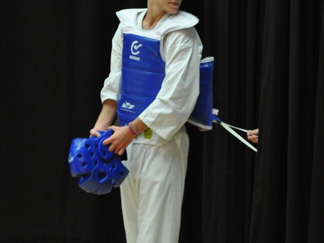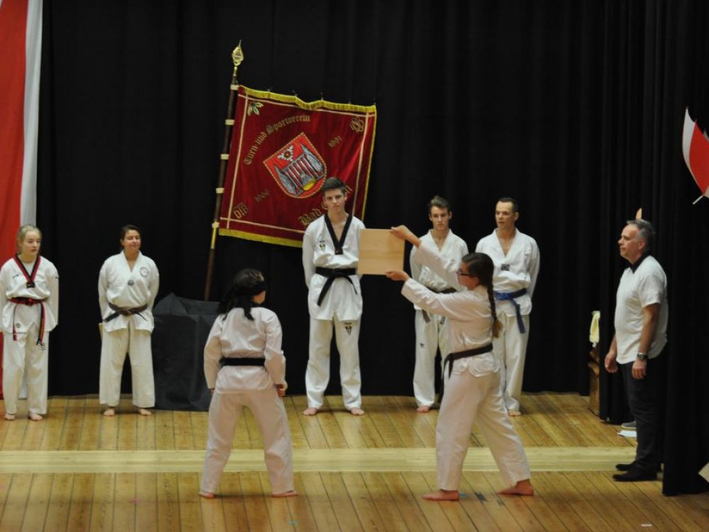 Vor einer Prüfungskommission von drei hochrangigen Prüfern der Niedersächsischen Taekwondo Union (NTU,)